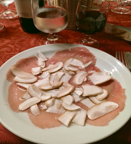 Iniziamo con un #albese ai funghi porcini, un #tortino di funghi, #tagliatelle ai funghi e #risotto ai funghi, #funghi fritti. Potremmo proseguire, dato che sono in menù secondi di carne coi funghi, ma per decenza e rispetto al nostro fegato, preferiamo fermarci, innaffiando il tutto con del Pelaverga del Saluzzese a km.0.