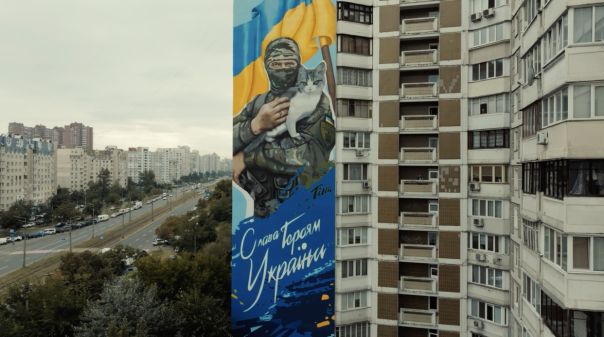 E' raffigurato sulla facciata di un palazzo, in questa bell'immagine, alta una quindicina di piani, sullo sfondo i colori della bandiera ucraina, giallo e azzurro, mentre tiene sulla spalla il gatto di #Donetsk. "Gloria agli eroi dell'Ucraina, dice il breve testo.
