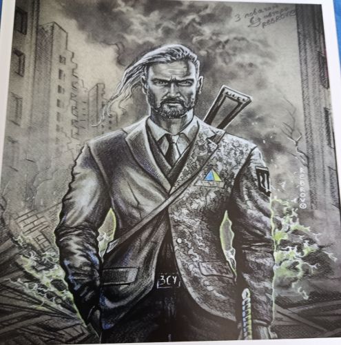 l' eganza formale del completo e della cravatta e la brutalità del contesto bellico (armi, edifici distrutti, fumo). La patch blu‑giallo e la sigla ЗСУ rimandano alle Forze Armate ucraine.