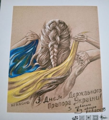 Questa stampa artistica è un'opera patriottica di Rebrov, per la festività del 23 agosto. Questo fondo color seppia arricchisce l'immagine di una giovane donna, con la treccia ed i capelli lunghi quasi avvolti nella bandiera e dai suoi colori. Anche in questa occasione, i simbolismi sono parecchi: le spighe di grano tra i capelli, i ricami sulla camicetta, la dedica benaugurale, "con rispetto" che celebra la giornata della bandiera nazionale.