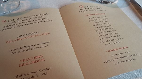Il rituale è molto gradevole. Si svolge nella sala delle Maschere del Castello, alla presenza dello storico Camillo Benso di Cavour che presenta i Cavalieri, i quali giurano di diffondere la gastronomia, i vini e i prodotti delle Langhe, seguendo un copione che raggiunge il clou dell’investitura, con il tradizionale “sorso” di Barolo, la proclamazione del Gran Maestro Bianca Vetrino e la firma sul grande Libro dei Cavalieri, contenente più di 1600 firme in 50 anni di fondazione dell’Ordine.