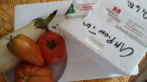Prodotti a Km 0 del Piemonte, composti da melanzane bianche e pomodori (cuore di bue, tondo e perino) che accompagnano i gustosi formaggi della Casearia AgricolSud.