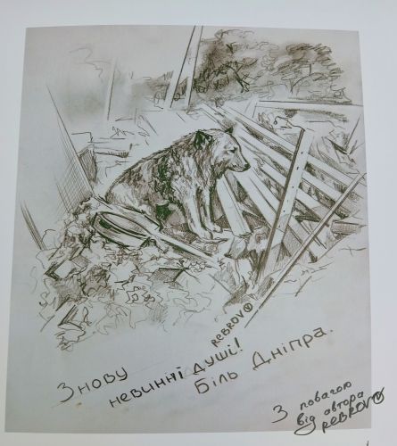 Dnipro, 29 settembre 2022 - Ancora dolore mostra questa immagine in chiaroscuro, opera artistica di Rebrov. Un cane, tra le macerie, della sua casa, distrutta da un attacco missilistico russo che uccise anche tutta la famiglia. Solo il cane, Krym, si salvò. Fu trovato dai soccorritori ferito, mentre ululava di dolore, tra i resti della casa bombardata.