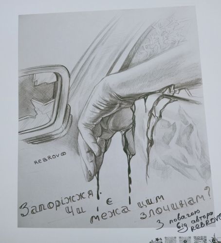 Anche la seconda opera cita una città: Zaporizhia. Anche in questo caso la mano sanguinante, inerme, indica la morte di un civile ucciso nella sua auto. Il vetro dello specchietto laterale frantumato.