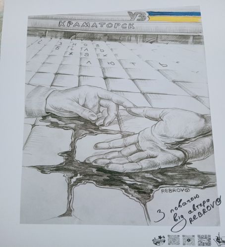 La terza ed ultima opera di questo trittico commemora la tragedia di Kramatorsk dell'aprile 2022, avvenuta nella stazione ferroviaria, mentre era in atto l'evacuazione dei civili. Visibile in alto il logo delle ferrovie (Y3) ed i colori della bandiera ucraina. Al centro due mani si sfiorano, per l'ultima volta, in una pozza di sangue. Sul pavimento tante lettere in cirillico, che interpretiamo come parole perdute nel caos dell'esplosione.